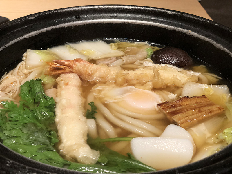 海外旅行前は和食にしたくて、海鮮丼かなーと思ってたのですが、海外出張によく行く人が「何かあると行けないから、離陸直前にナマモノは食べないようにしている」と言ってたのを思い出して、つるとんたんの鍋焼きうどんにしました♪